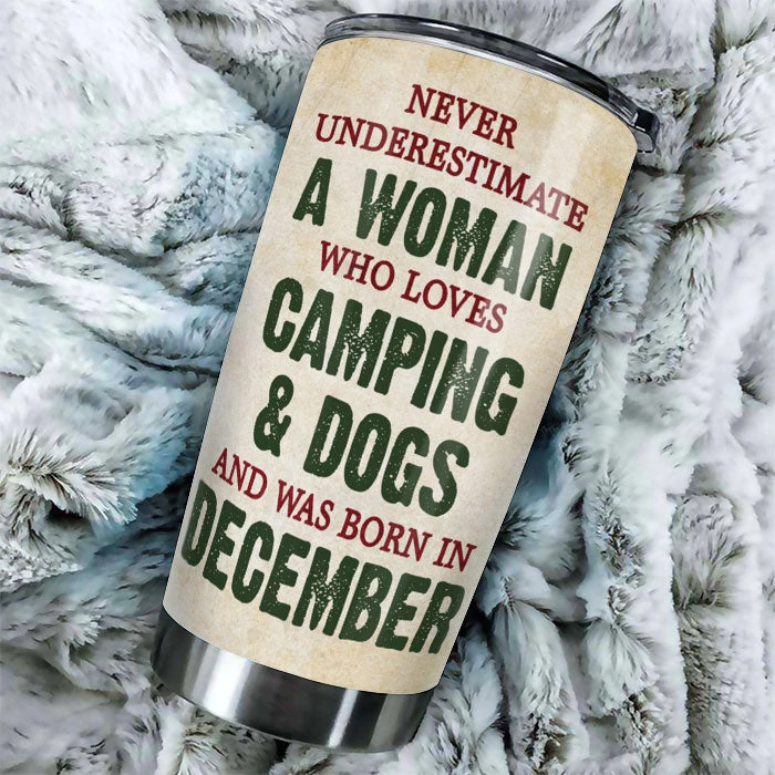 Message: “Never underestimate a woman who loves camping and was born in…”.