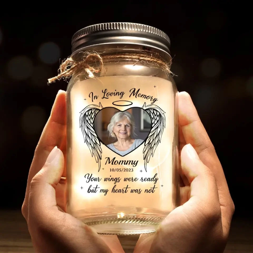 Custom Photo Forever In Our Hearts – Memorial Personalized Custom Mason Jar Light – Sympathy Gift For Family Members