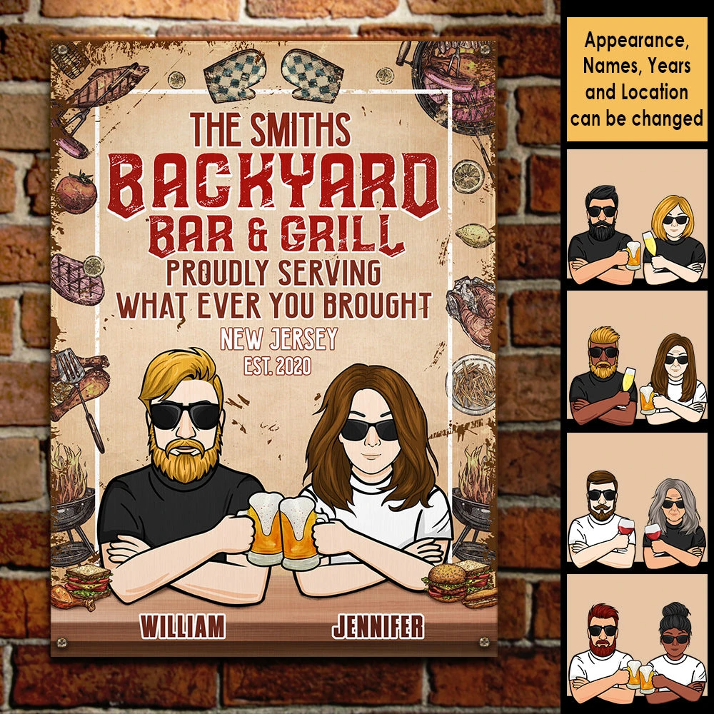 Message: “Family backyard bar & grill, proudly serving whatever you bought”.