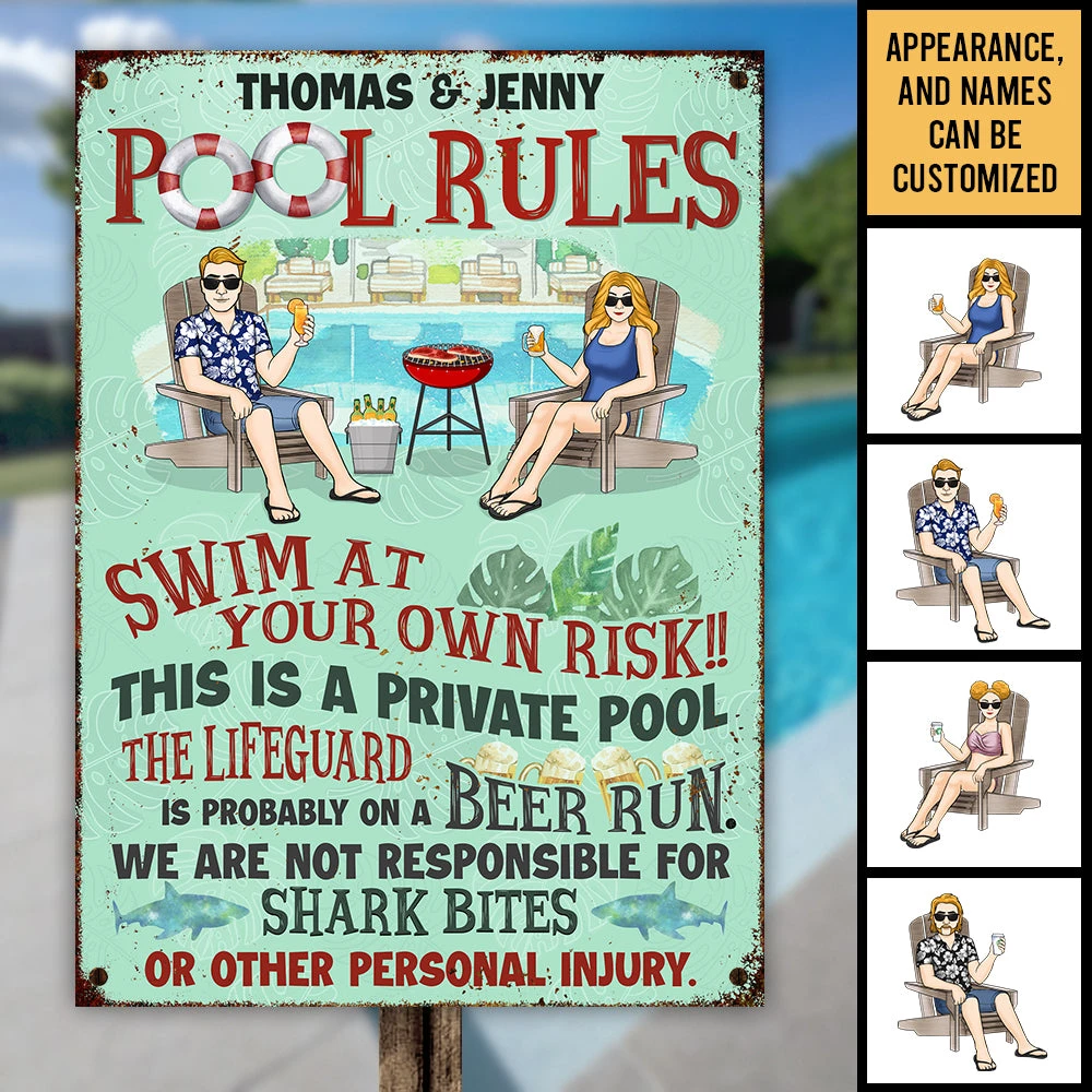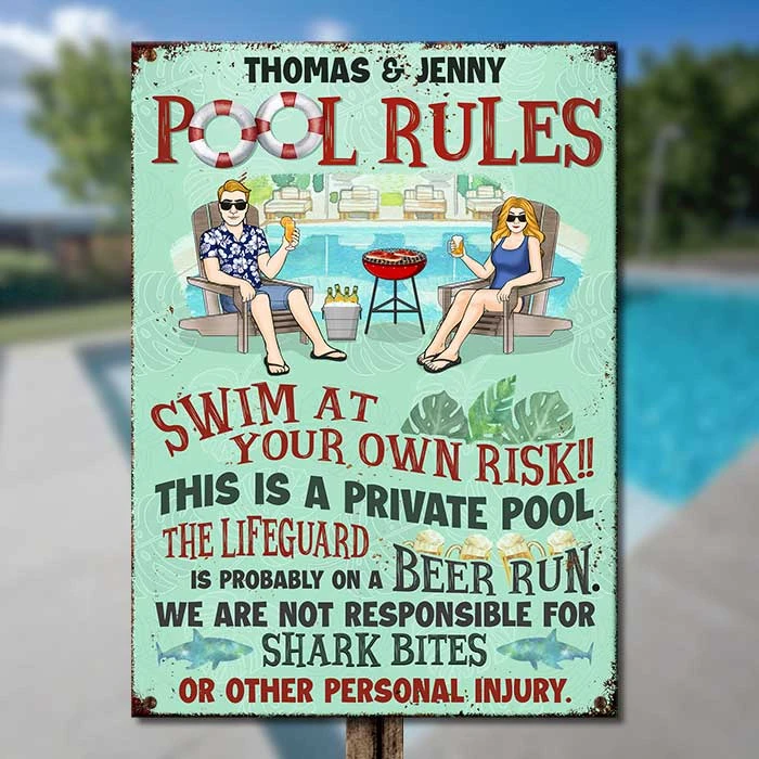 Message: “Pool rules. Swim at your own risk. This is a private pool”.
