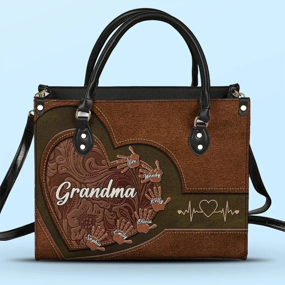 My Heart Belongs To My Grandkids – Family Personalized Custom Leather Handbag – Gift For Mom, Grandma