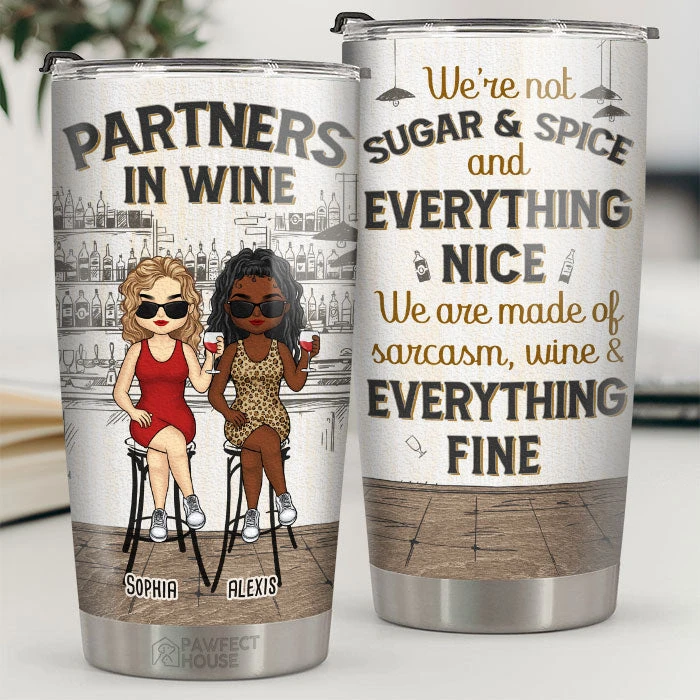 “Partners in wine – We’re not sugar & spice and everything nice. We’re made of sarcasm, wine & everything fine.